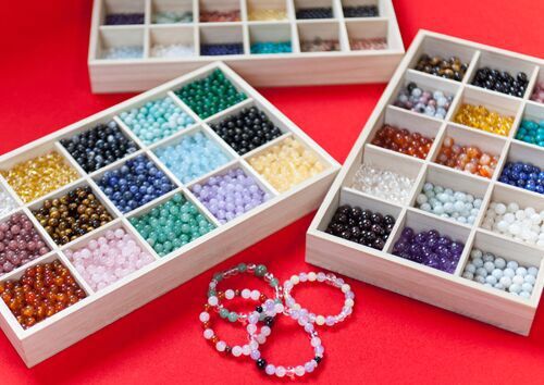 腕念珠づくり体験では誕生石やご利益などから好みの天然石を自由に選び作ることができます。